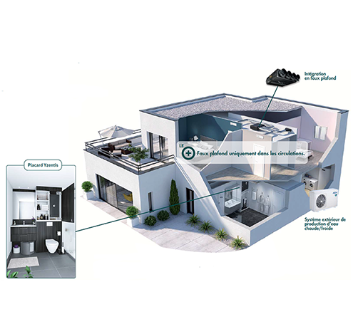 - Tous les équipements sont intégrés dans un placard technique unique, ou en faux plafond.
